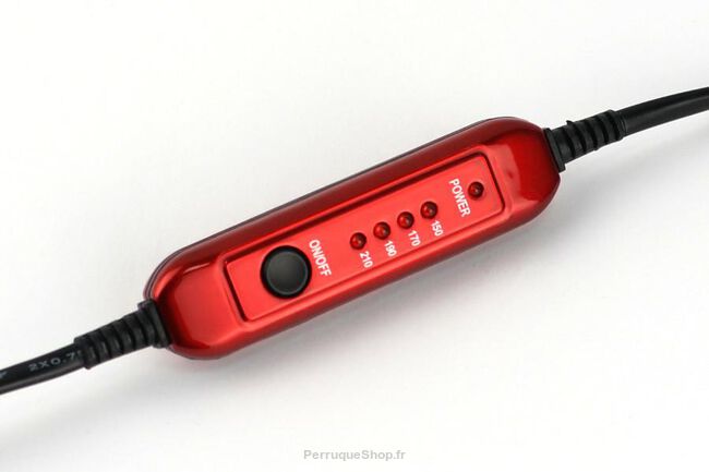 Un petit fer pour pose d'extensions de cheveux à chaud pour rallonges de cheveux, facile à utiliser et à nettoyer, avec contrôle de la température et long câble. Embouts en téflon, suspension de travail et support dédié. rouge.
