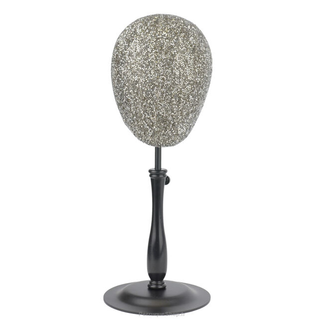 La surface de la tête est recouverte de cristaux décoratifs qui reflètent magnifiquement la lumière et dont la texture rugueuse permet à la perruque de rester en place sans que les cheveux et la base ne risquent de glisser et de se salir. Cette finition confère à l'ensemble un aspect glamour intéressant - ce porte-perruque sera un élément de design esthétique en soi.