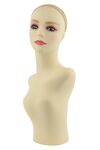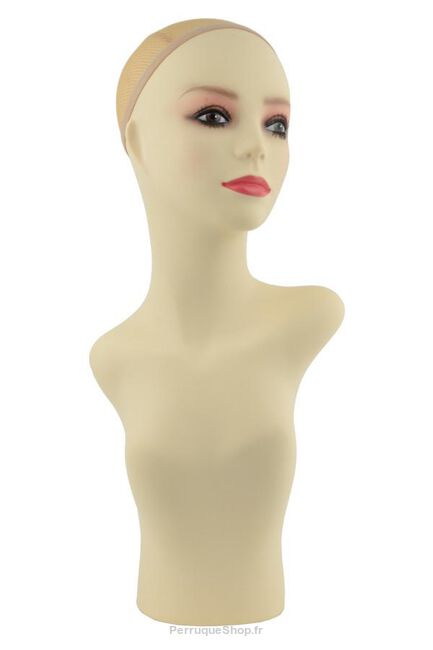 La tête mannequin pour vitrines (buste) conçue pour présenter des perruques, des couvre-chefs et des foulards. Il a une chair neutre qui ressemble à la de la peau (ni trop jaune, ni trop rose) et des cils collés. Sa surface n'est pas trop glissante. L'avantage de la coiffe est la présence permanente d'une maille, qui garantit que la perruque ou autre produit appliqué reste en place et ne glisse certainement pas. La tête est très stable grâce à son poids, et il est également possible de la monter sur un trépied (par exemple pour prendre des photos).