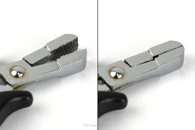 Les pinces ont des pointes dentelées assez larges et puissantes qui écrasent rapidement les liens de kératine. Les poignées antidérapantes permettent une prise en main sûre et un travail rapide et efficace lors de l'enlèvement de mèches longues.