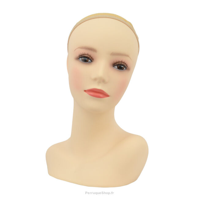 La tête mannequin pour vitrines (buste) conçue pour présenter des perruques, des couvre-chefs et des foulards. Il a une chair neutre qui ressemble à la de la peau (ni trop jaune, ni trop rose) et des cils collés. Sa surface n'est pas trop glissante. L'avantage de la coiffe est la présence permanente d'une maille, qui garantit que la perruque ou autre produit appliqué reste en place et ne glisse certainement pas. La tête est très stable grâce à son poids, et il est également possible de la monter sur un trépied (par exemple pour prendre des photos).