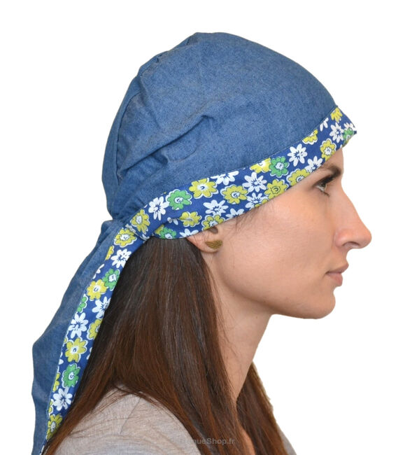 Turban réversible, mélange de denim fin et de coton. Il est doté de cordons courts très pratiques qui permettent de l'attacher rapidement à l'arrière de la tête. Un classique en denim confortable, une solution pratique au quotidien pour compléter votre tenue et vous protéger du soleil ou du froid.
