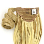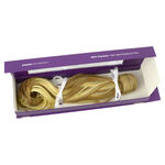 La base du chignon est dotée d'une triple pince intégrée, facile à fixer dans les cheveux. Pour un rendu plus naturel, une mèche de finition est incluse : elle permet de dissimuler la fixation sans avoir recours à un élastique. Cette mèche se fixe solidement à l’aide d’un scratch (velcro).