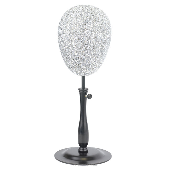 La surface de la tête est recouverte de cristaux décoratifs qui reflètent magnifiquement la lumière et dont la texture rugueuse permet à la perruque de rester en place sans que les cheveux et la base ne risquent de glisser et de se salir. Cette finition confère à l'ensemble un aspect glamour intéressant - ce porte-perruque sera un élément de design esthétique en soi.
