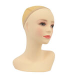 La tête mannequin pour vitrines (buste) conçue pour présenter des perruques, des couvre-chefs et des foulards. Il a une chair neutre qui ressemble à la de la peau (ni trop jaune, ni trop rose) et des cils collés. Sa surface n'est pas trop glissante. L'avantage de la coiffe est la présence permanente d'une maille, qui garantit que la perruque ou autre produit appliqué reste en place et ne glisse certainement pas. La tête est très stable grâce à son poids, et il est également possible de la monter sur un trépied (par exemple pour prendre des photos).
