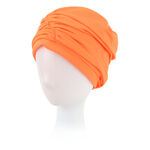 Turban de bain léger et confortable avec un drapé décoratif de tissu au niveau du front. Les problèmes de santé ou la période de convalescence ne doivent pas toujours signifier des restrictions d'activité. Le turban Aqua est un modèle conçu pour les visites à la piscine, les baignades en mer ou au lac. Il est idéal comme bonnet obligatoire dans une piscine intérieure ou comme protection de la tête par temps ensoleillé entre les entrées successives dans l'eau. Grâce à l'utilisation d'un matériau approprié, le turban est léger et sèche rapidement après avoir été mouillé. Il sera donc un couvre-chef idéal pour les excursions au bord de l'eau. Le turban est plissé sur toute la tête, ce qui lui donne un volume optique. La doublure douce assure un confort de port avec une peau sensible. La bande élastique cousue aide à adapter le turban à la forme de la tête et à le maintenir en place.