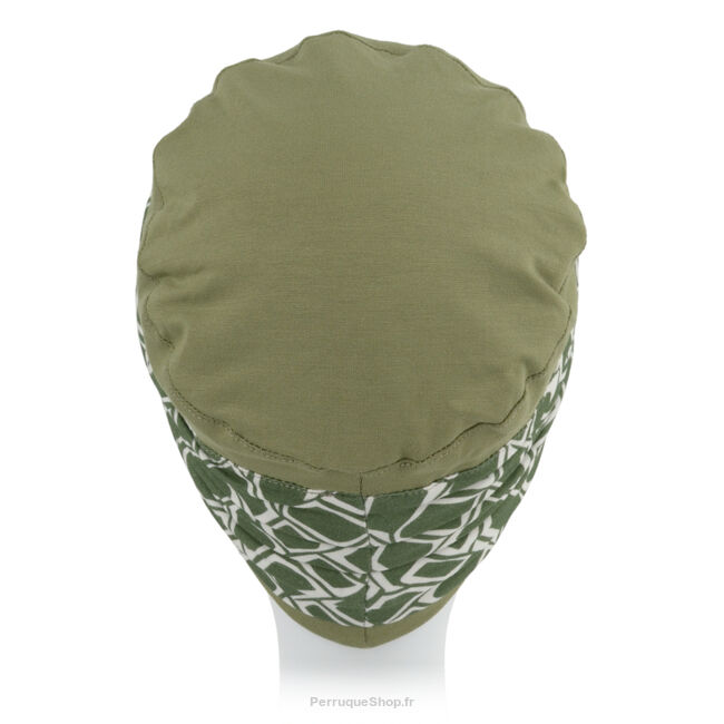 Un bandeau de tissu froncé entoure le turban, ajoutant du volume à la coiffure. La combinaison de viscose et d’élasthanne permet au turban de s’adapter à la forme de la tête sans exercer de pression.