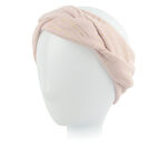 Turban deux pièces dans une couleur pastel claire avec des coutures dorées. Grâce à sa doublure, ce turban sera parfait pour les journées fraîches d'automne. Le bonnet est complété par un bandeau réalisé dans le même tissu et tressé comme une natte.